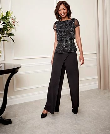 Impeccable for formal looks, Adrianna Papell’s flowing crepe pant showcase a wide-leg silhouette and a subtle draped overlay.