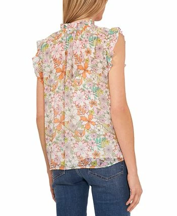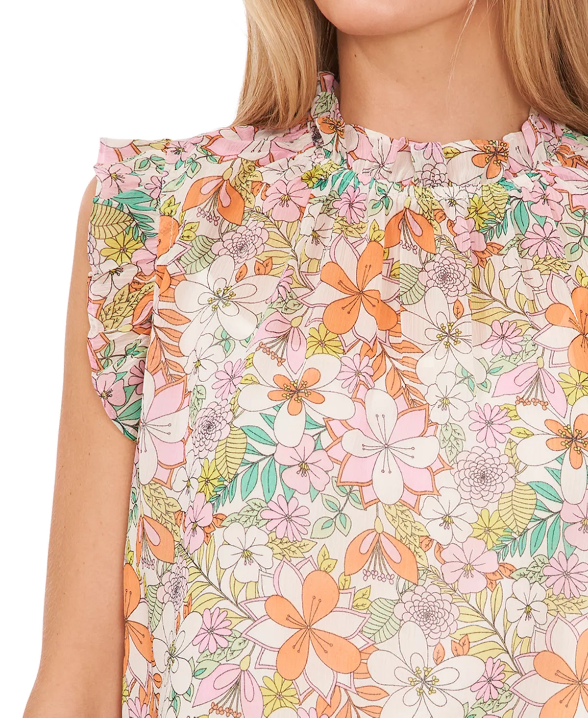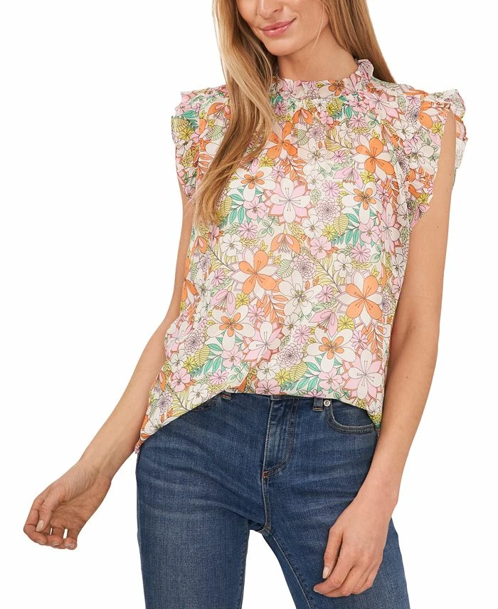 CeCe’s sleeveless floral-print top dresses things up courtesy of ruffle details at the neck and cuffs.