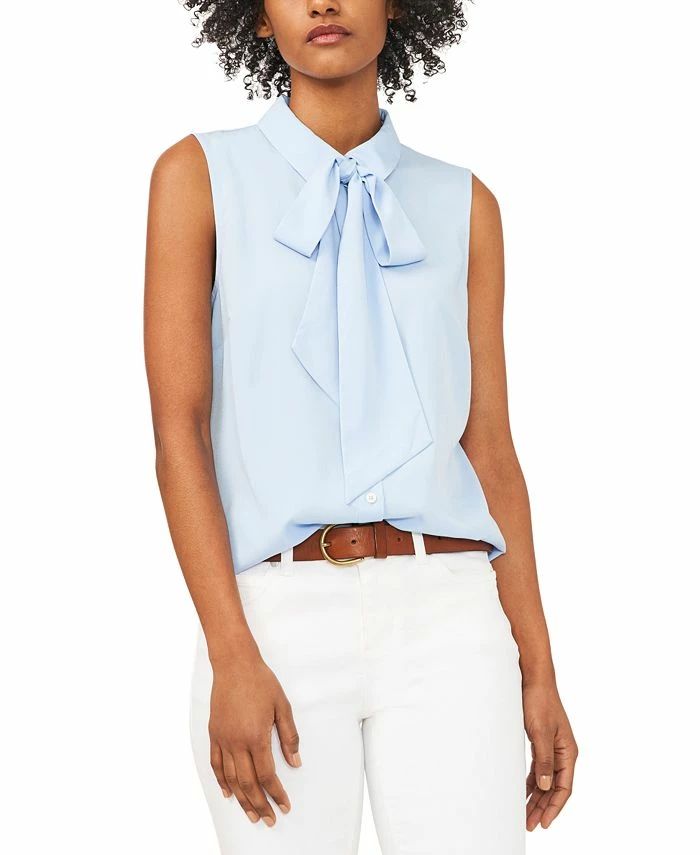 Designed with a sleeveless silhouette for effortless layering, CeCe’s button-front top is fashioned with an adjustable neck bow for a sophisticated pop.