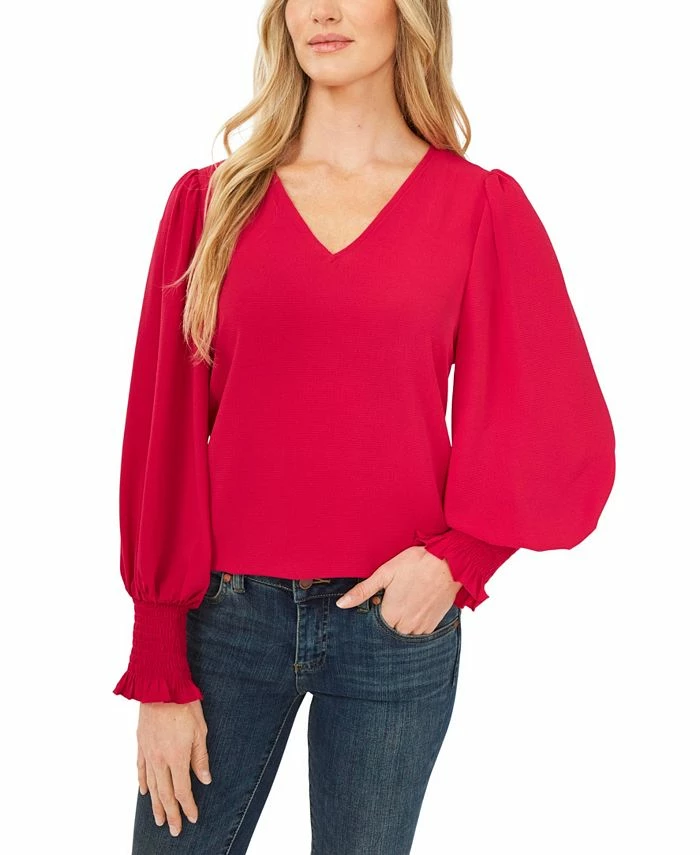 Dainty sheer sleeves with smocked cuffs frame this V-neck soft texture blouse from CeCe.
