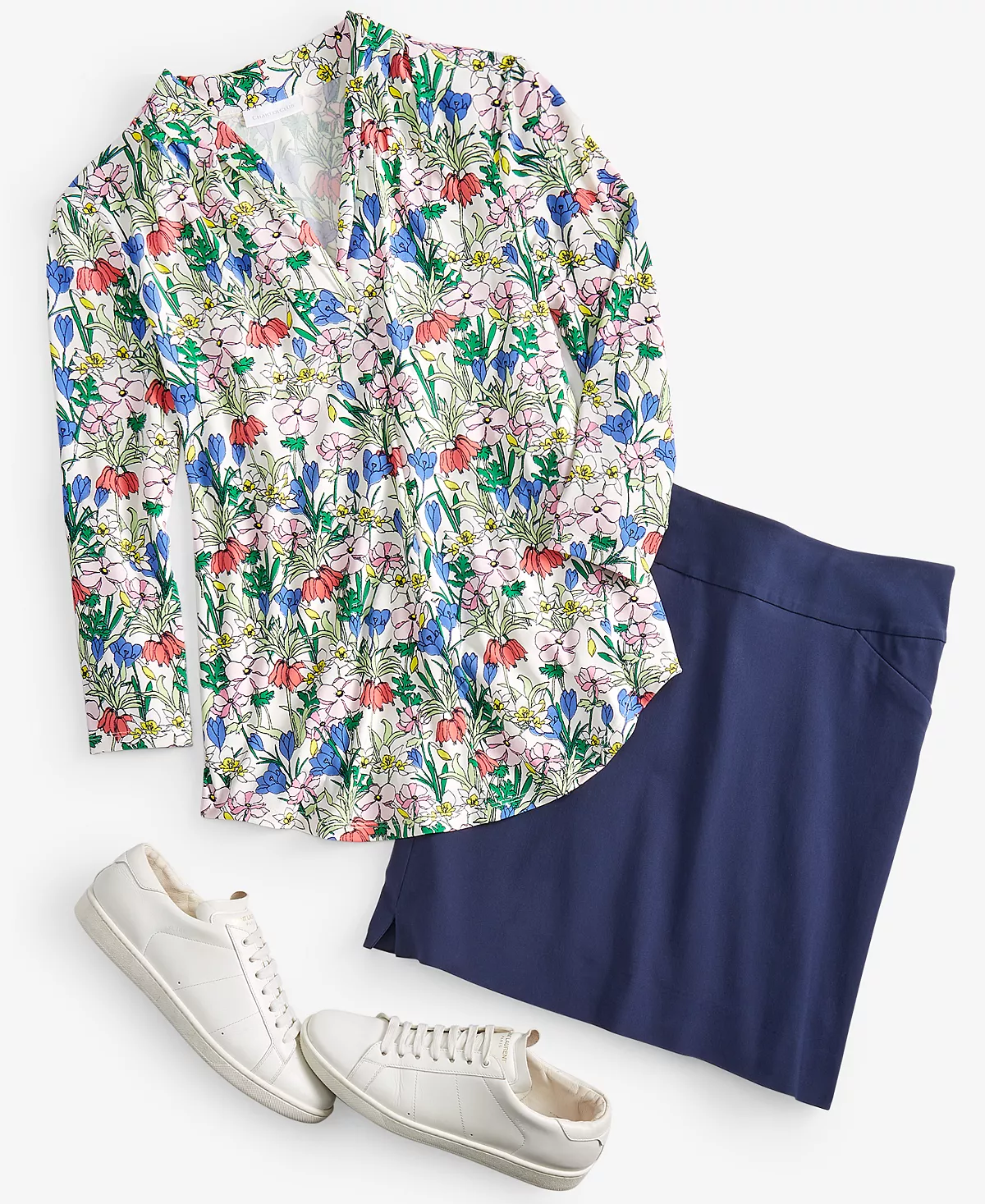 A charming floral print adds eye-catching detail to this soft woven top from Charter Club.