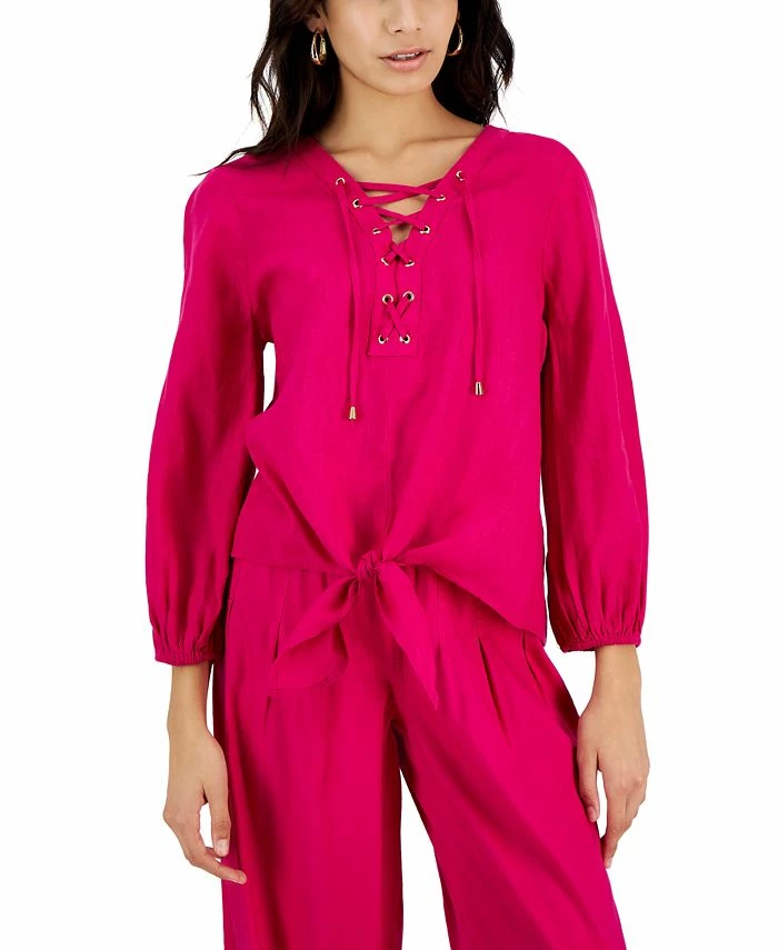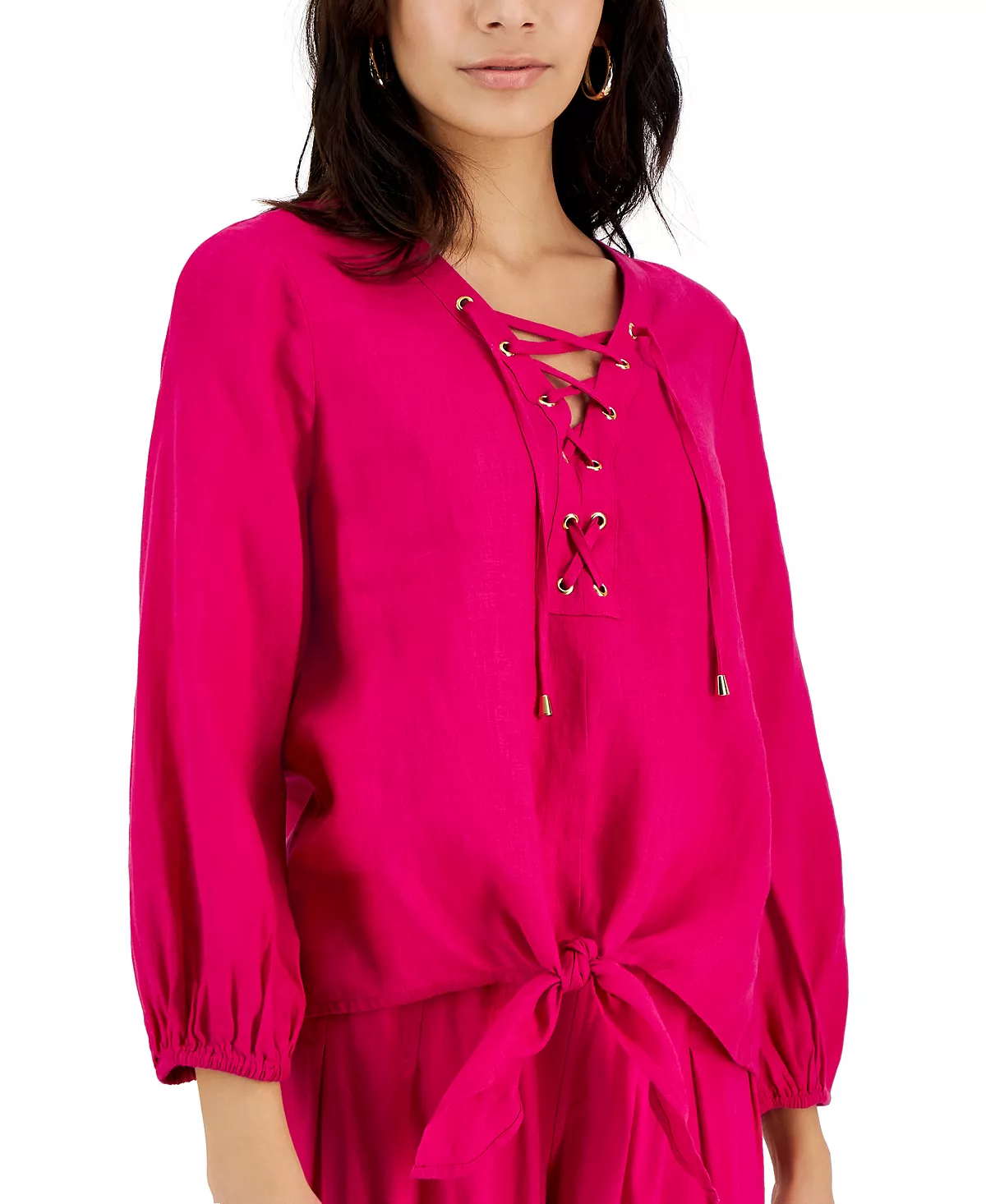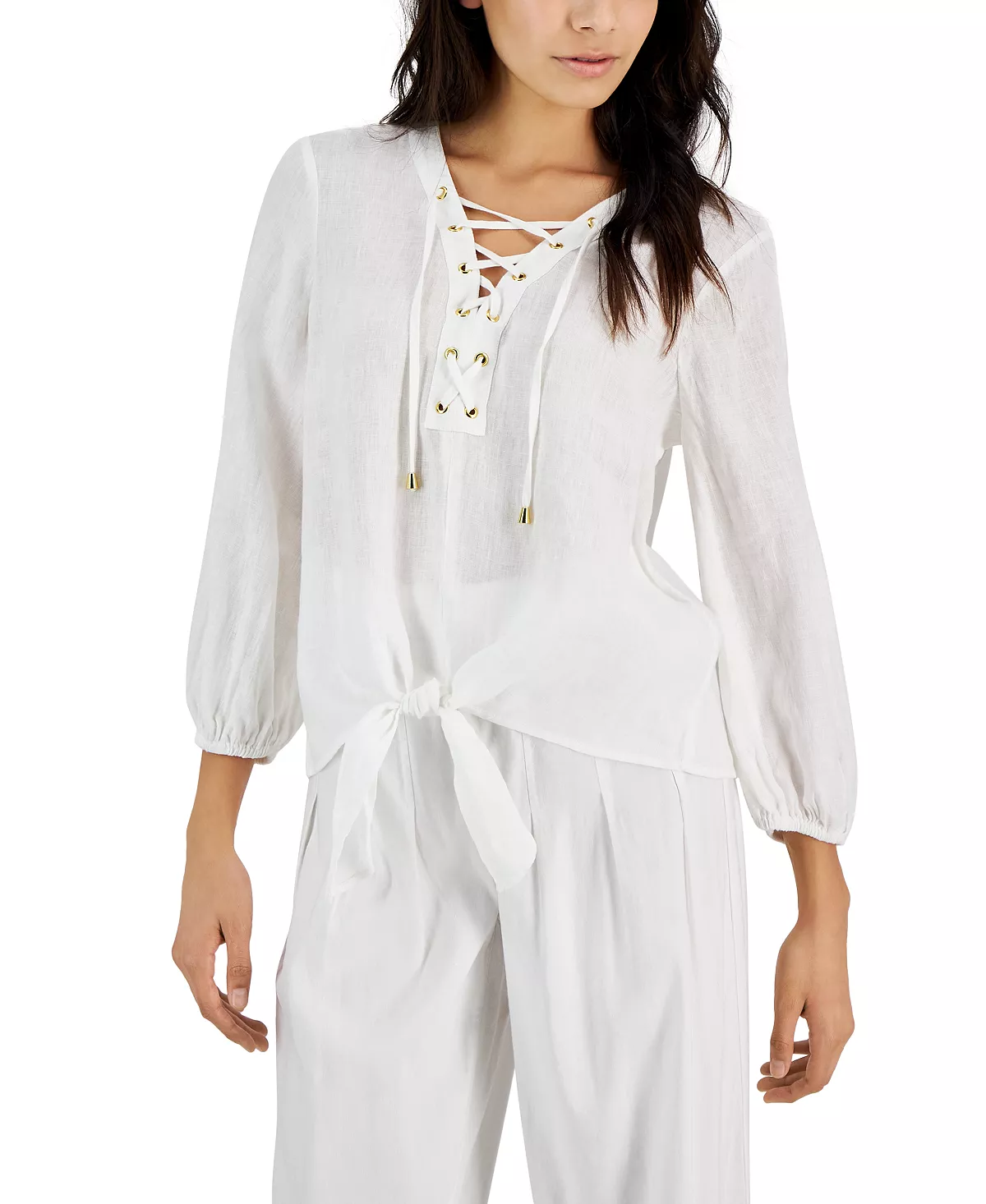 Comfort meets style with this lace-up, tie-hem blouse from INC International Concepts.