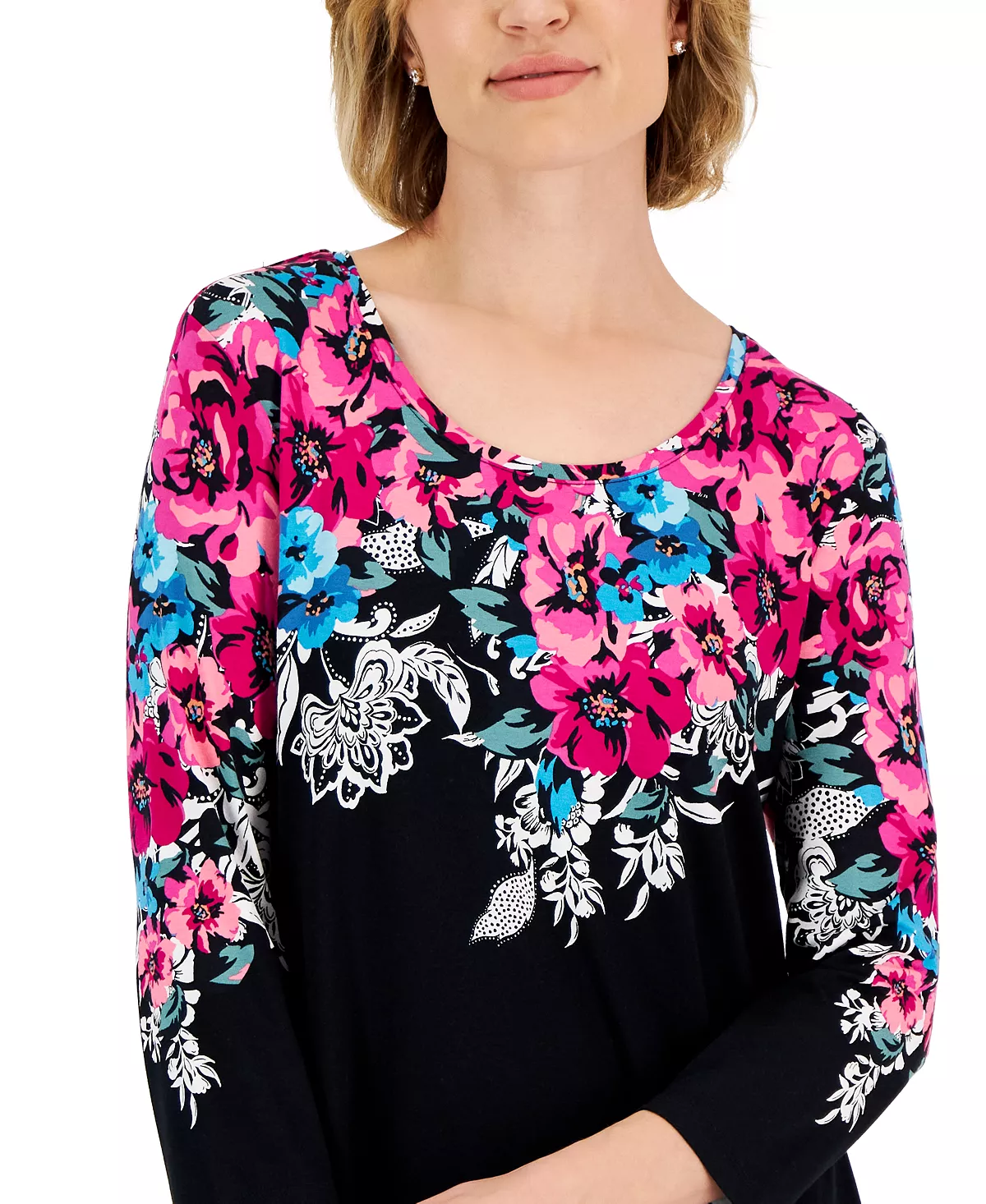Vibrant florals drift into bold contrast tones, bringing a stunning new look to JM Collection’s relaxed knit top.