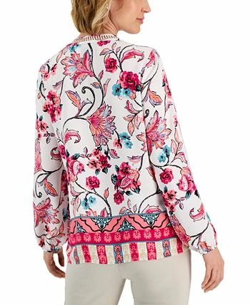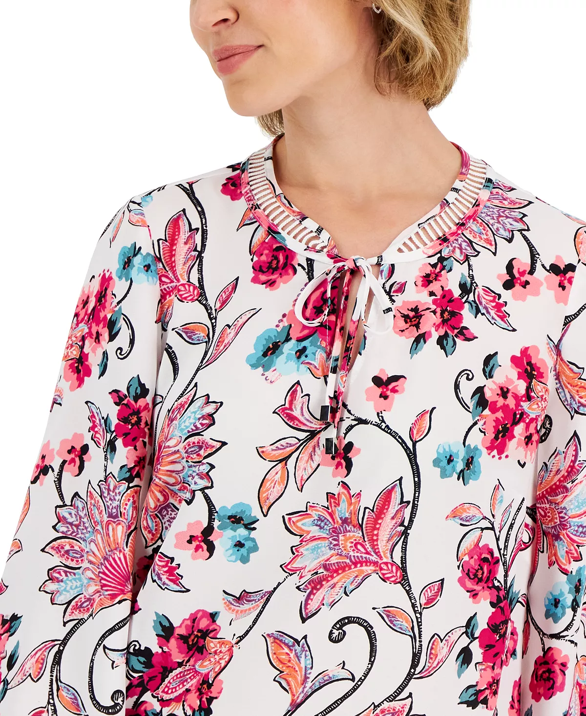 A border print adds a contemporary touch to vibrant florals, bringing a fresh look to this woven top from JM Collection. Lattice at the neckline stylishly frames your face.