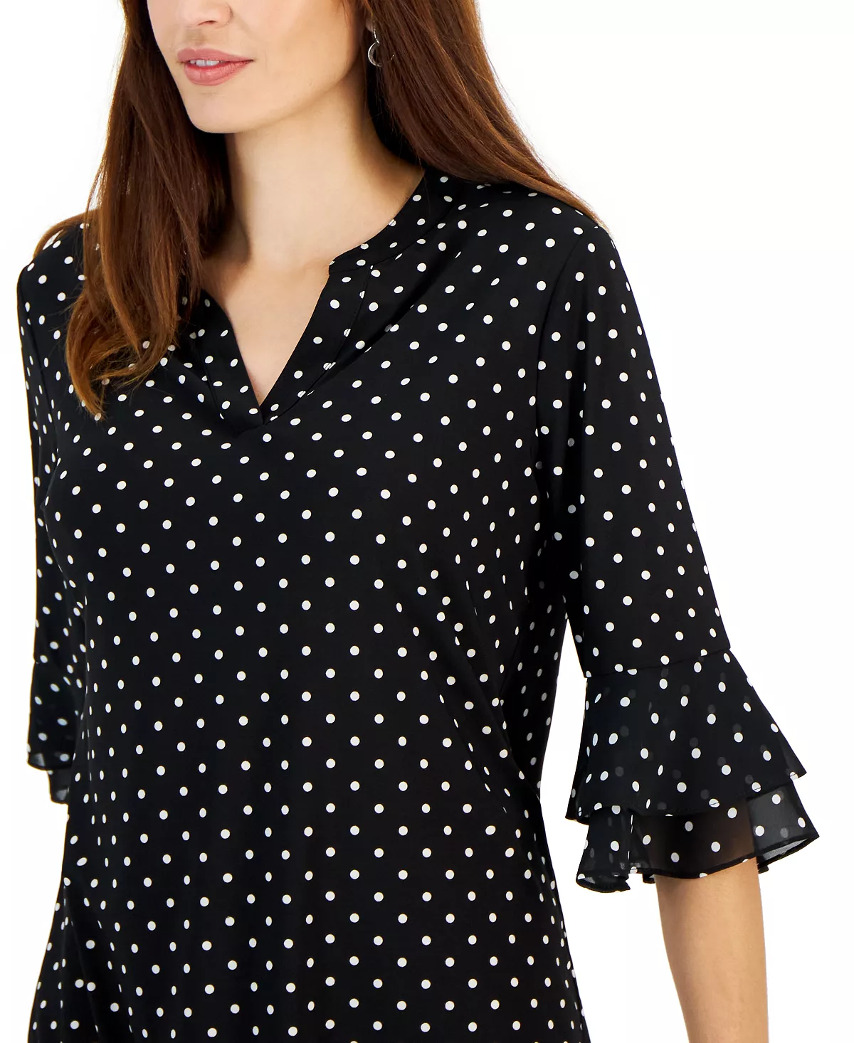 Framed by elbow-length sleeves and tiered flutter cuffs, Kasper’s split-neck top adds a polished appeal to tailored trousers or sleek pencil skirts.