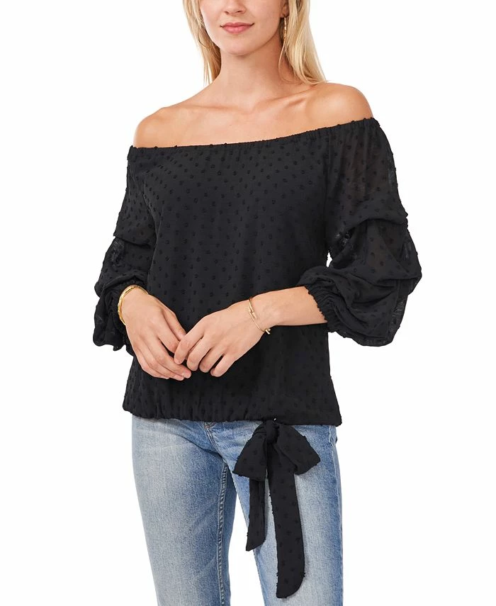 This stylish blouse from Vince Camuto combines a chic clip-dot texture with an elegant off-the-shoulder neckline and voluminous sleeves.