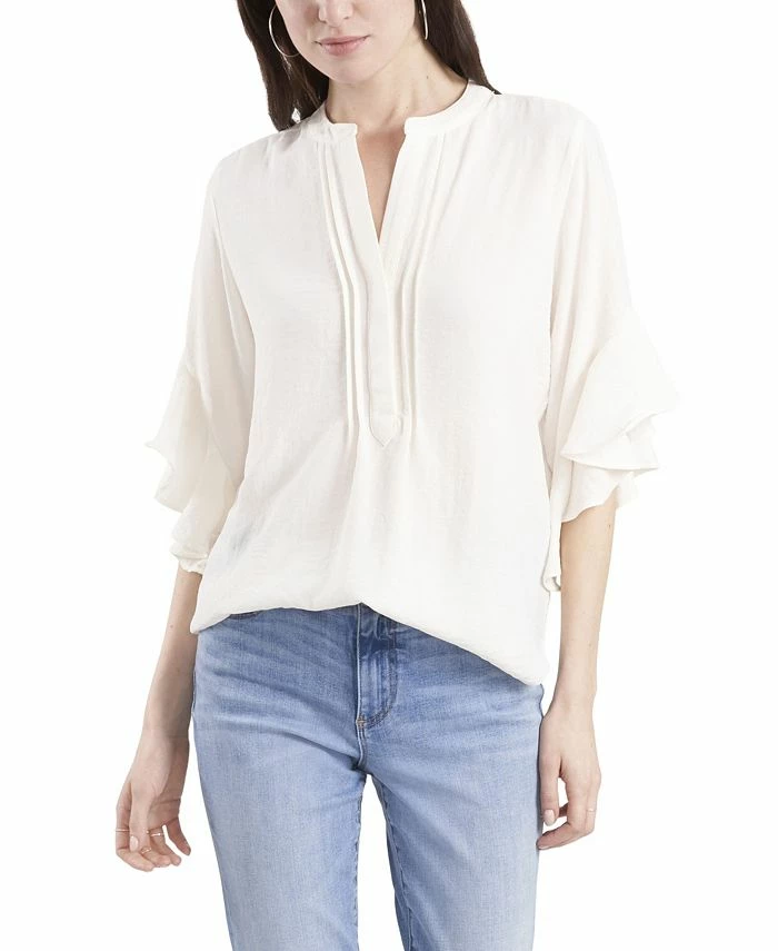 Vince Camuto’s ruffle sleeve henley blouse is fabulous and feminine. Statement ruffle sleeves and split neck styling will keep you on trend this season.